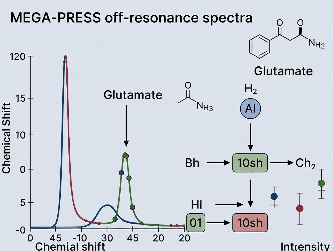 MEGA-PRESS utilizes frequency-selective refocusing pulses to modulate the evolution of scalar (J)-coupled spin systems. For coupled spins like those in GABA and Glx, the signal intensity in a spin echo depends on whether the J-coupling is allowed to evolve. The sequence alternates between two sub-experiments: