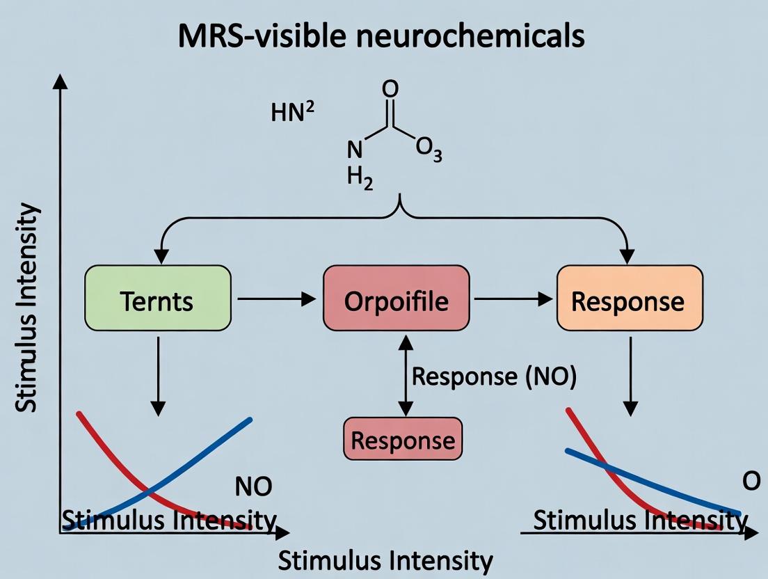 This article provides a comprehensive analysis of the relationship between sensory, cognitive, or pharmacological stimulus intensity and the quantifiable response of key neurometabolites detectable by Magnetic Resonance Spectroscopy (MRS). Targeted at researchers and drug development professionals, we first establish the foundational principles of MRS-visible neurochemicals and their physiological roles. We then detail the methodologies for designing intensity-response paradigms and acquiring robust MRS data. The article critically addresses common challenges in quantifying these responses and offers optimization strategies for experimental design and analysis. Finally, we examine validation frameworks and comparative analyses across neurochemical systems, consolidating current evidence and highlighting the translational potential of this approach for understanding brain function, disease mechanisms, and therapeutic development.
