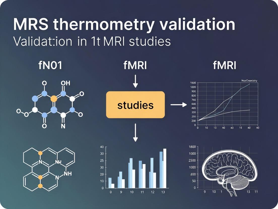MRS thermometry represents a powerful, non-invasive tool for validating and enriching fMRI studies by providing direct, quantifiable metabolic temperature data. Through foundational understanding, rigorous methodology, diligent troubleshooting, and systematic validation against established standards, researchers can reliably integrate this technique. Its ability to disentangle thermal effects from neurovascular coupling holds significant promise for basic neuroscience and, crucially, for drug development where thermoregulatory side effects or targeted thermo-pharmacology are of interest. Future directions include the development of faster, multi-voxel spectroscopic imaging thermometry techniques, improved modeling of temperature-metabolism relationships, and broader application in clinical trials for neurological and psychiatric disorders. By solidifying its validation framework, MRS thermometry is poised to transition from a specialized research method to a standardized biomarker in advanced fMRI protocols.